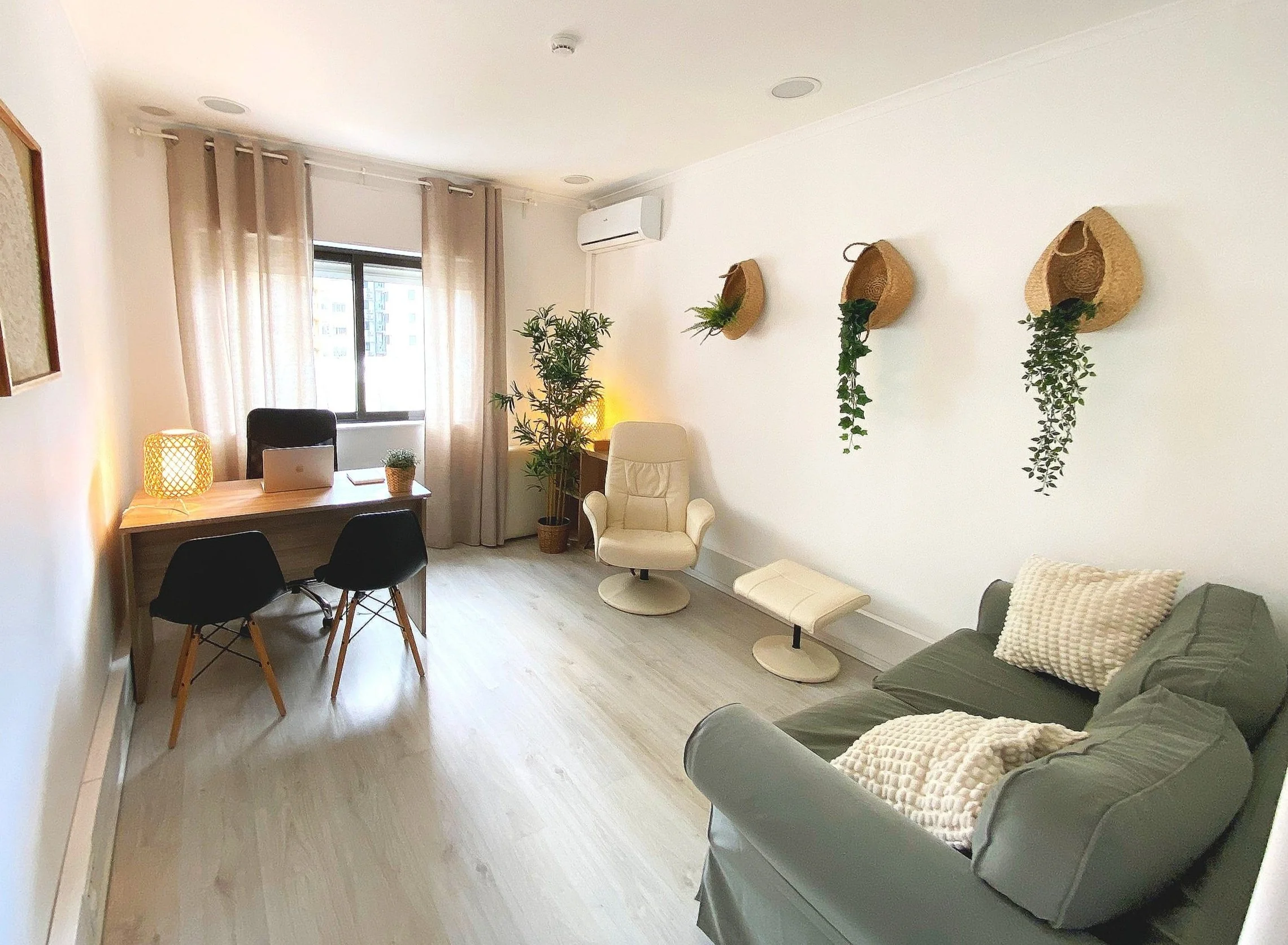 Cabinet de psychothérapie très chaleureux à Lisbonne. Siège blanc pour la psychologue face à un canapé vert
