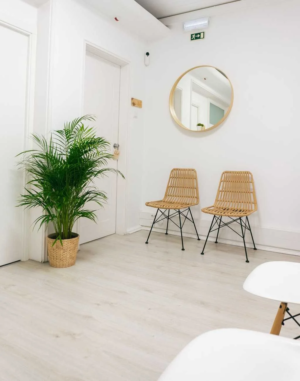 Femme assise portant une robe, avec des cheveux longs. Sourire bienveillant. Cabinet thérapie à Lisbonne, avec un décor minimaliste et moderne.